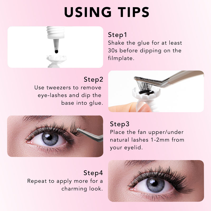 Pieteikšanās process ir ātrs un ērts. Sāciet, izvēloties vēlamās skropstu kopas un izliekot tās uz līdzenas virsmas. Pēc tam katra klastera pamatnei uzklājiet nelielu daudzumu mūsu DIY skropstu kopas līmes. Ļaujiet DIY skropstu klastera līmei dažas sekundes nožūt un pēc tam viegli nospiediet klasterus uz dabiskajām skropstām.
